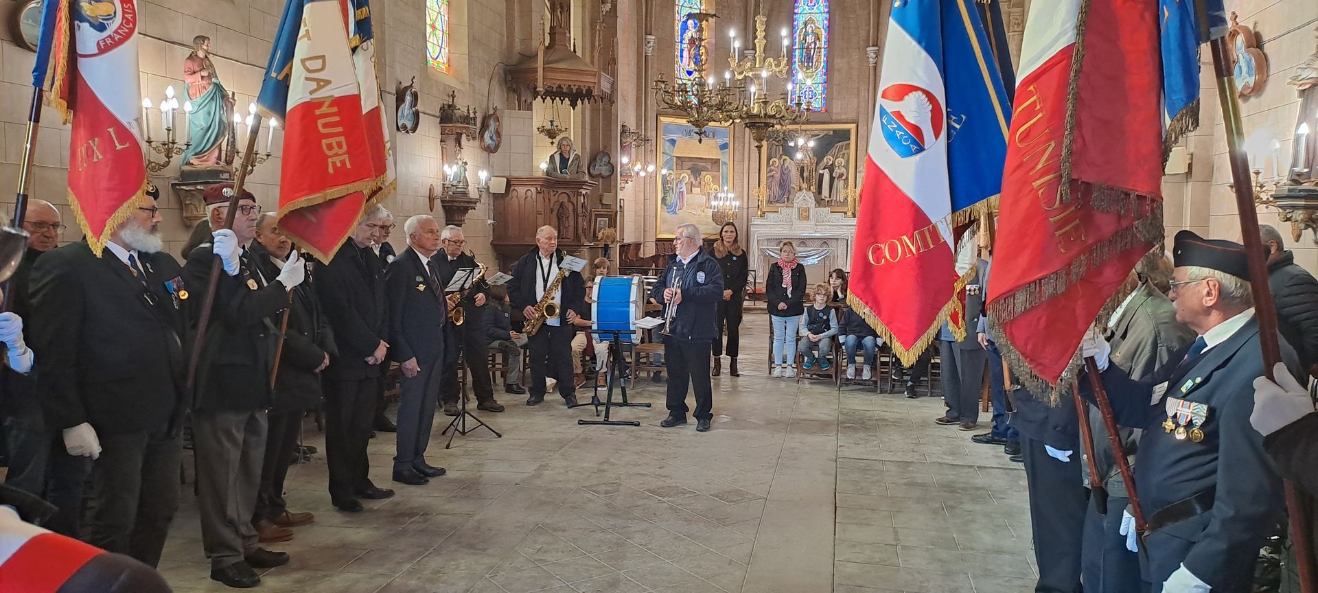Comme la pluie tombait ce jour là, les porte drapeaux, des enfants de l'école primaire venus prononcer un discours et les officiels ont fait la cérémonie à l'interieur et tournés vers le monument aux morts devant l'église