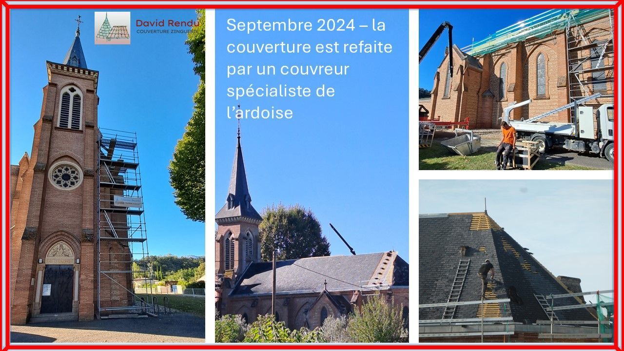 Après 130 ans, les ardoises sont devenues poreuses et à nouveau le ruisellement venait endommager les enduits interieurs refaits en 2021. La mairie de Couffouleux vote le financement pour un remplacement de toute la couverture en ardoise avec un specialiste local. L'entreprise de David RENDU intervient en Septembre 2024
